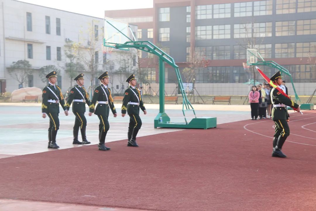 升国旗,全体师生唱国歌。伴随着嘹亮的国歌声,五星红旗冉冉升起,在冬日的暖阳下迎风飘扬。全校师生行注目礼,庄严而肃穆。