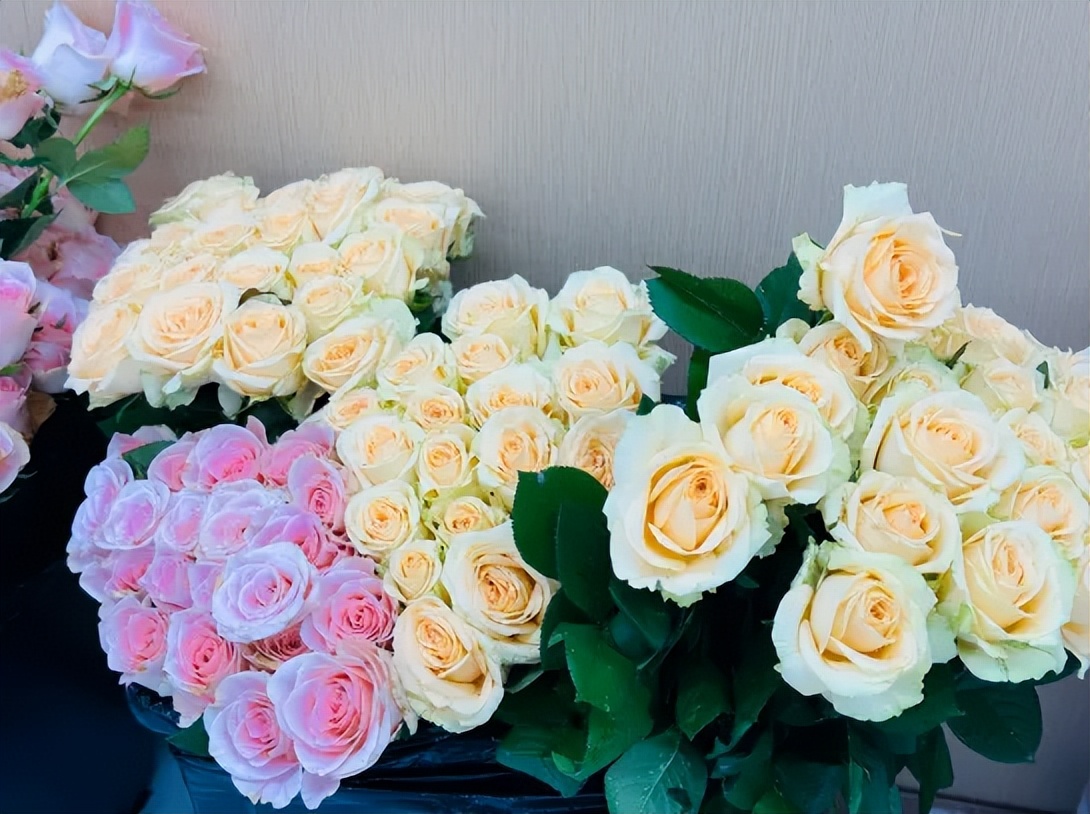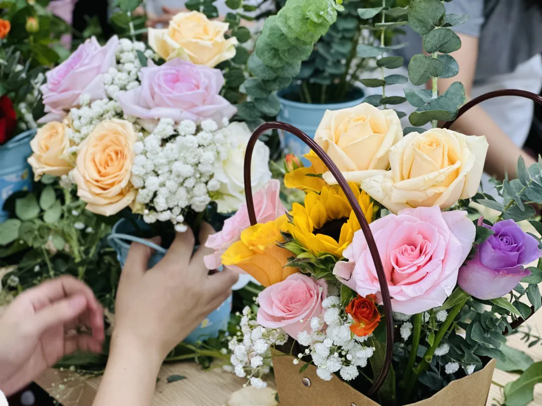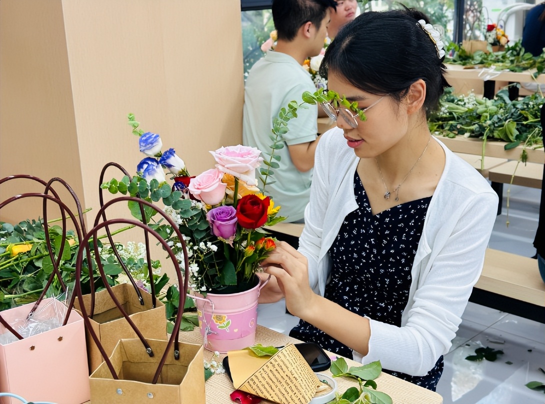 活动现场布置得温馨雅致,各色鲜花整齐摆放,剪刀、花泥、包装纸等工具一应俱全。