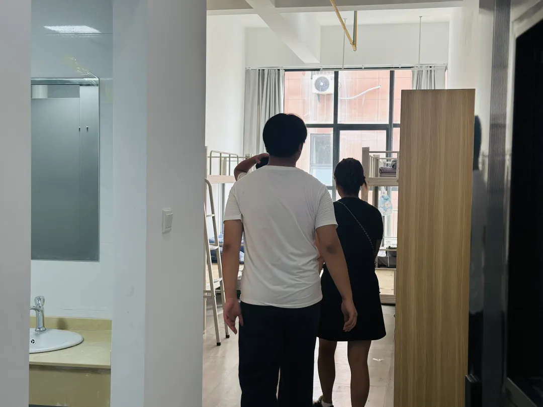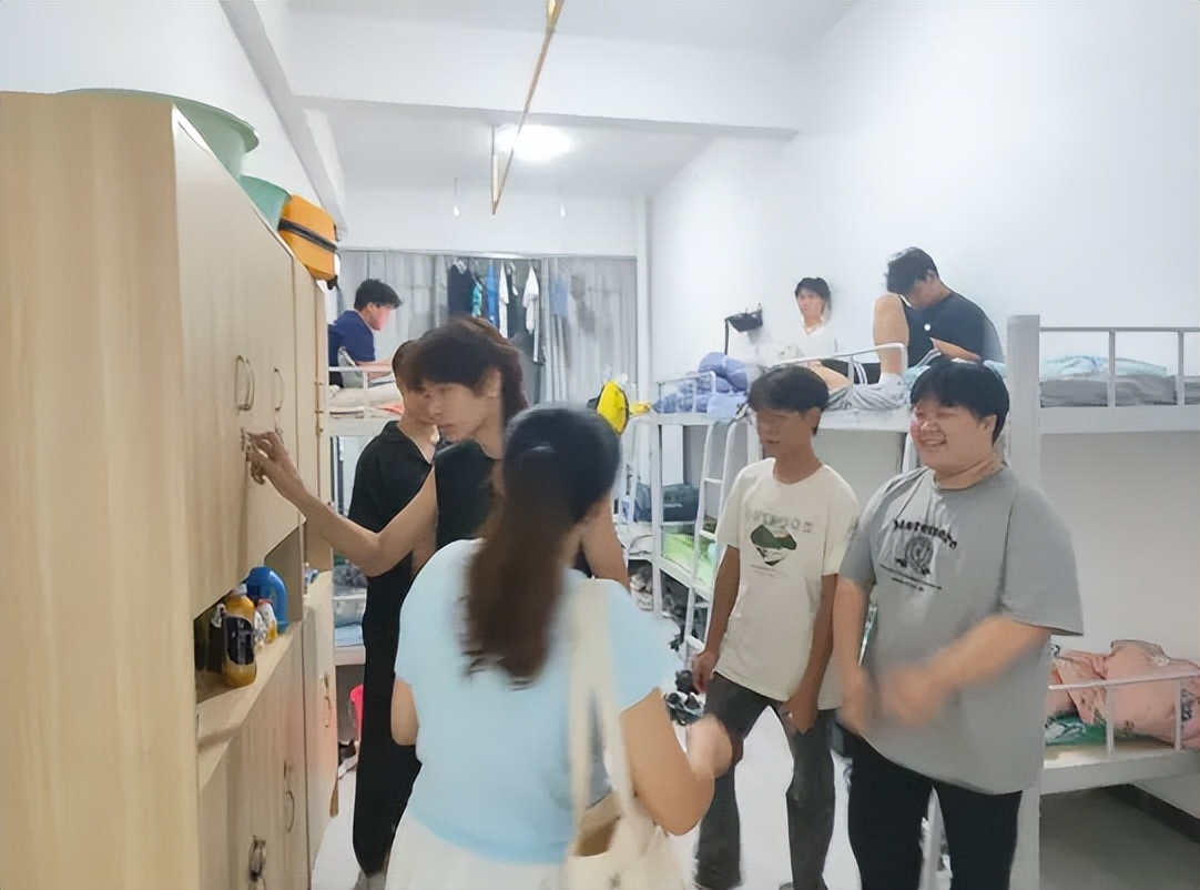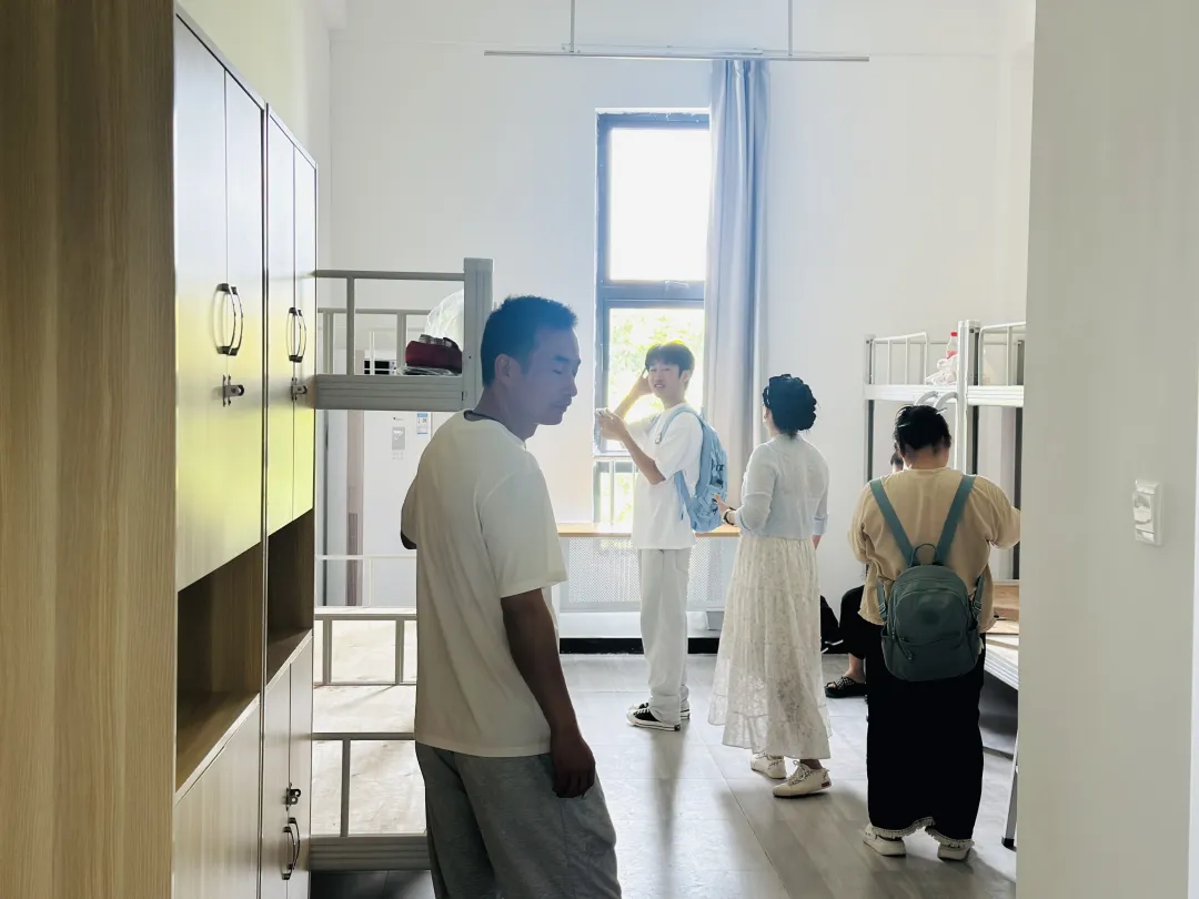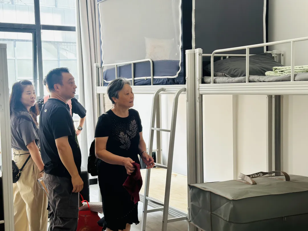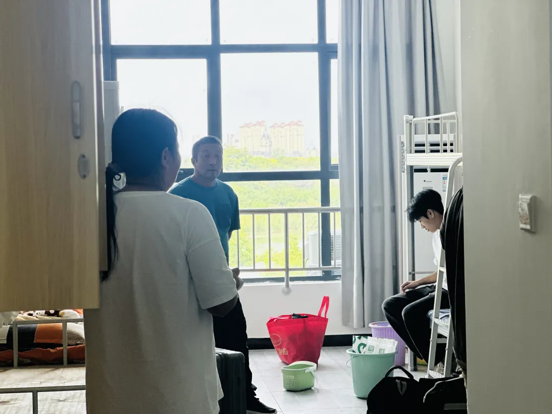 宿舍宽敞明亮、干净整洁,家长们帮新生搬运行李至宿舍内,协助他们整理床铺,叮嘱他们在校努力学习,照顾好自己。