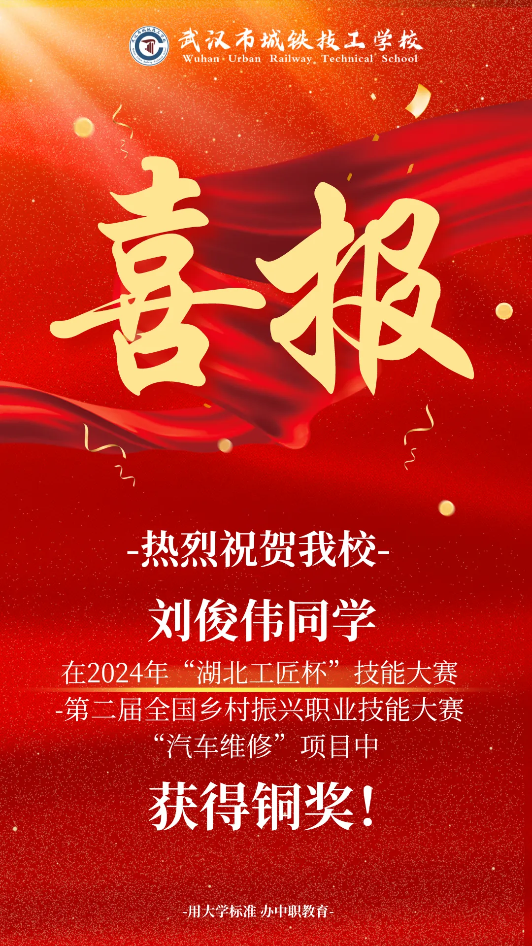 我校新能源汽车检测与维修专业2312班刘俊伟同学在2024年“湖北工匠杯”技能大赛——第二届全国乡村振兴职业技能大赛湖北省选拔赛“汽车维修”学生组赛项中,荣获铜奖!