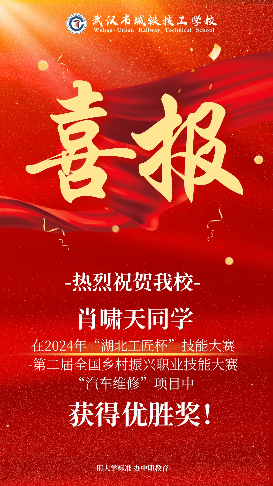 我校新能源汽车检测与维修专业2309班肖啸天同学在2024年“湖北工匠杯”技能大赛——第二届全国乡村振兴职业技能大赛湖北省选拔赛“汽车维修”学生组赛项中,荣获优胜奖!