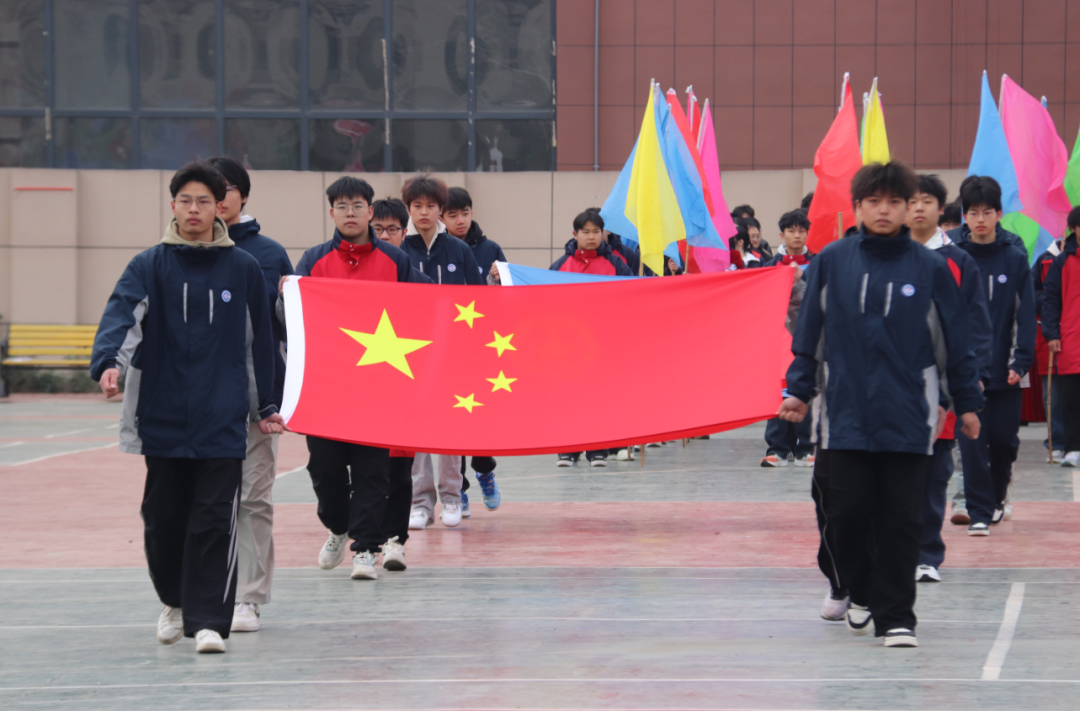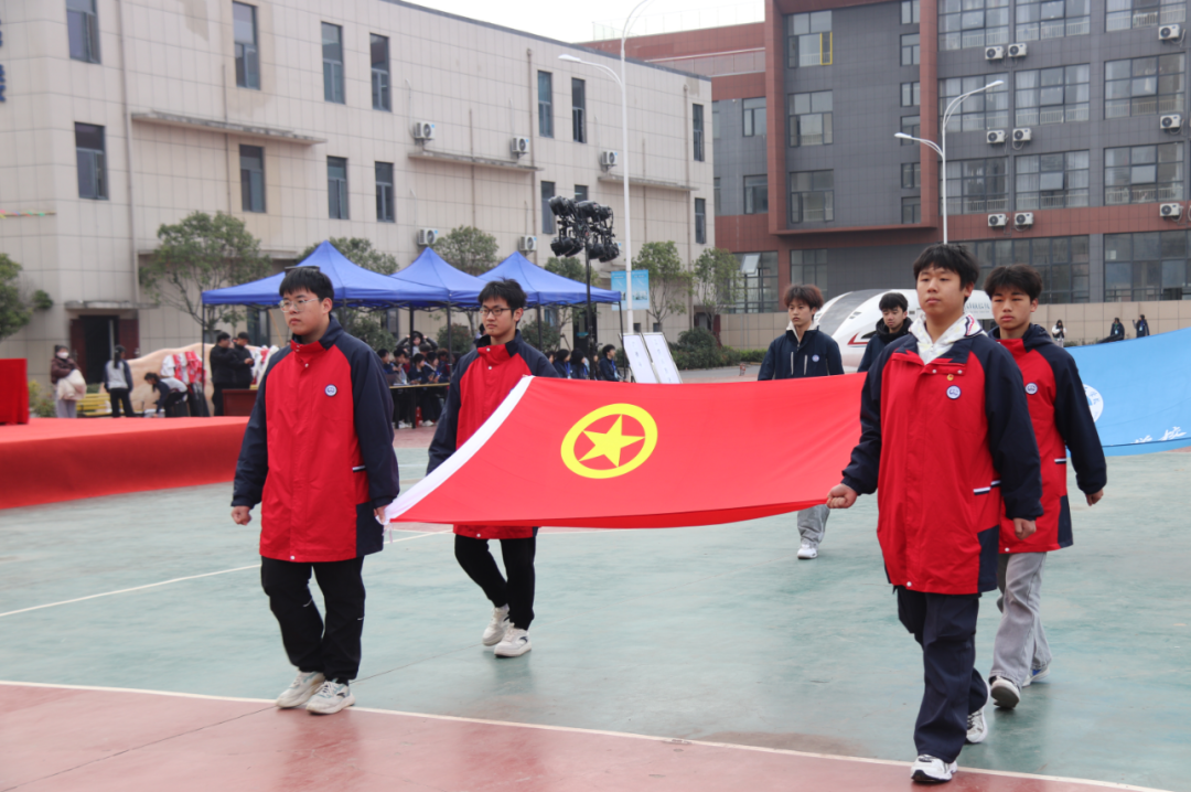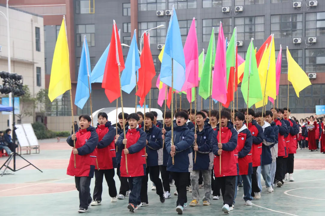 方阵入场仪式正式开启——五彩彩旗迎风招展,青春身影步履铿锵!国旗、团旗、校旗依次登场。