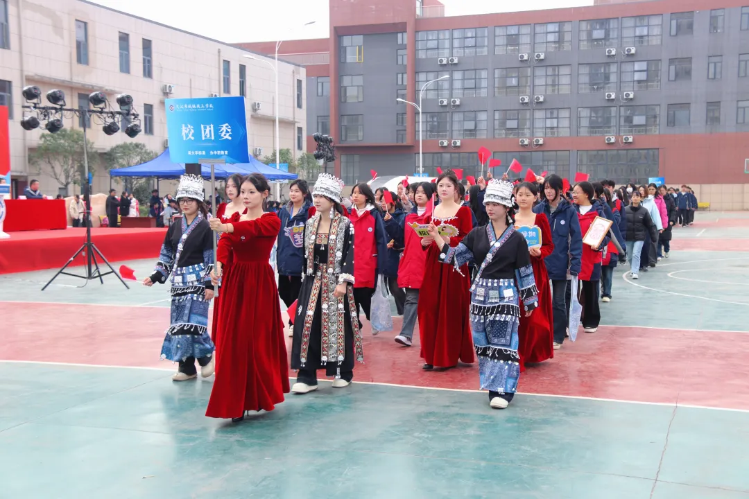 校团委代表方队率先走来,一面面彩旗点燃赛场激情,手工社巧手制作的精美装饰点缀其间,苗族服饰的绚丽纹样更添独特风采;一枚枚团徽闪耀使命担当,青年志愿者们意气风发,尽显志愿服务的热忱。他们以蓬勃朝气彰显社团特色,用昂扬姿态诠释青春担当,为运动会奏响热血激昂的奋进乐章!