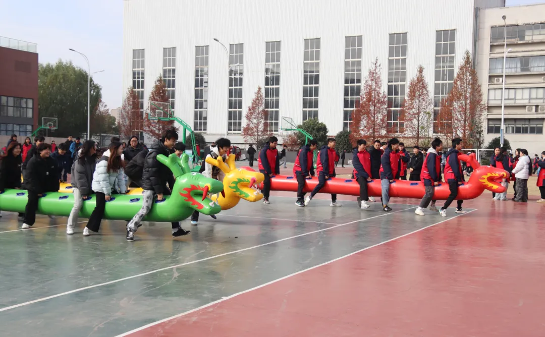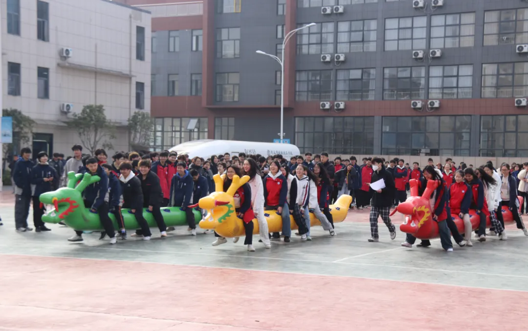 旱地龙舟赛场活力拉满,各班级参赛选手协同驾驭“龙舟”,双手紧握把手同步发力。随着裁判指令下达,队员们奋力前行,“龙舟”在赛道上快速移动,现场呐喊助威声此起彼伏,活力满满!