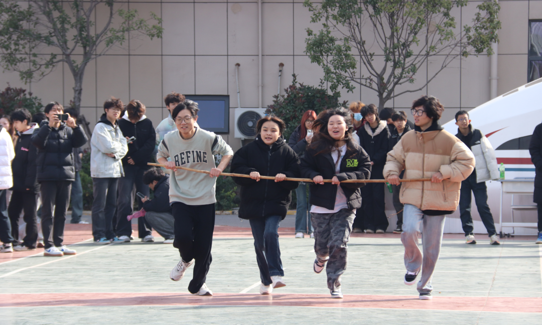 旋风跑项目考验团队默契,各班级参赛选手手抓竹竿紧密配合,迈着同步的步伐向终点冲刺。大家屏气凝神、步调一致,在奔跑中展现出超强的协作能力!