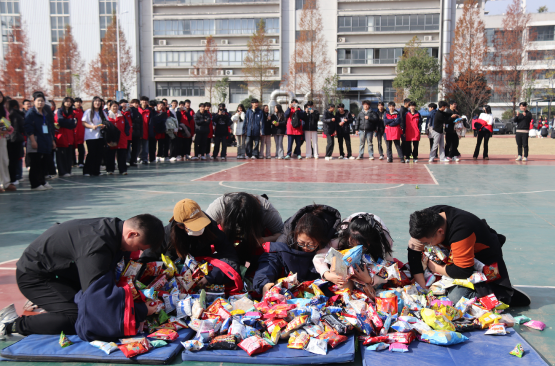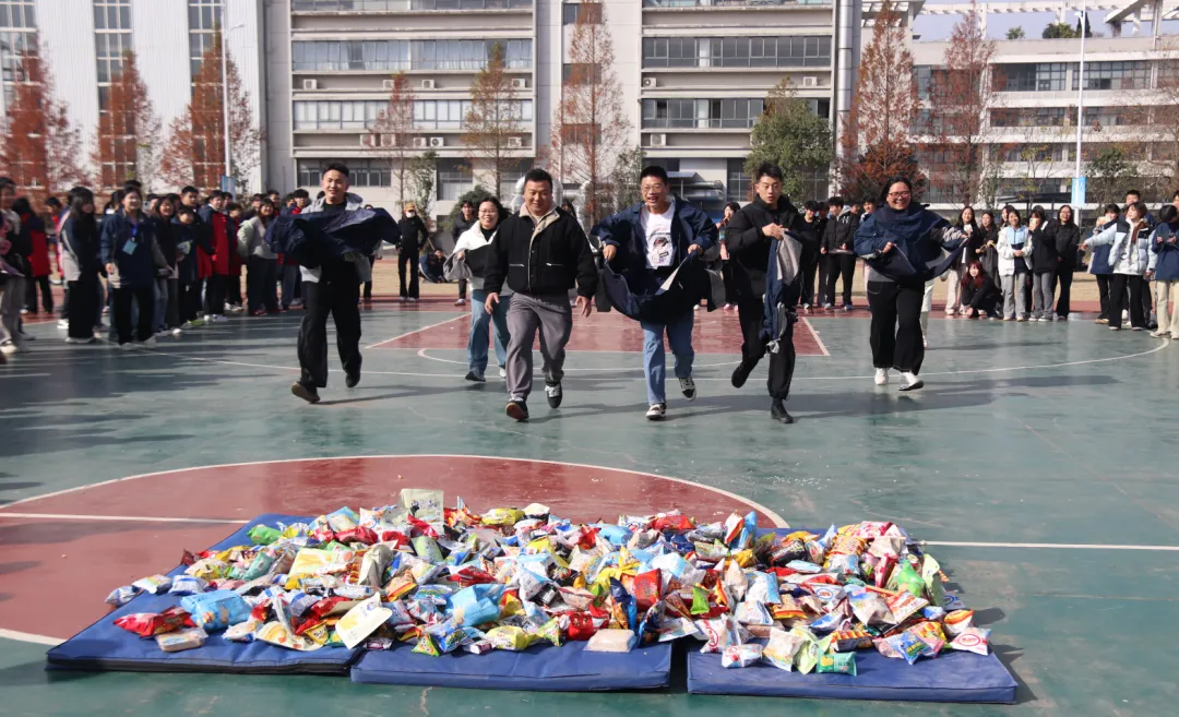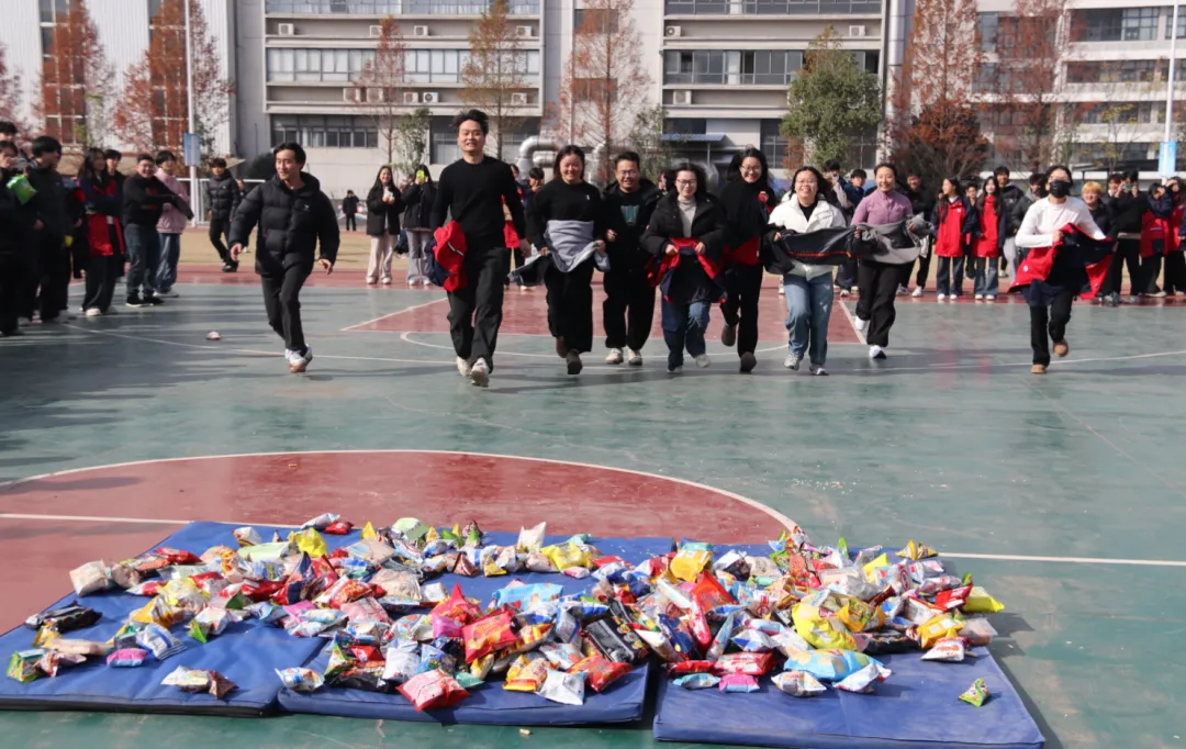 “零食大作战”更是点燃全场热潮!各年级班主任摩拳擦掌跃跃欲试。随着哨声响起,大家快步冲向零食堆,精准抓取后迅速返程,每人仅一次的抓取机会让现场悬念拉满。台下学子们加油声、欢呼声此起彼伏,还不忘为自家班主任呐喊支招。