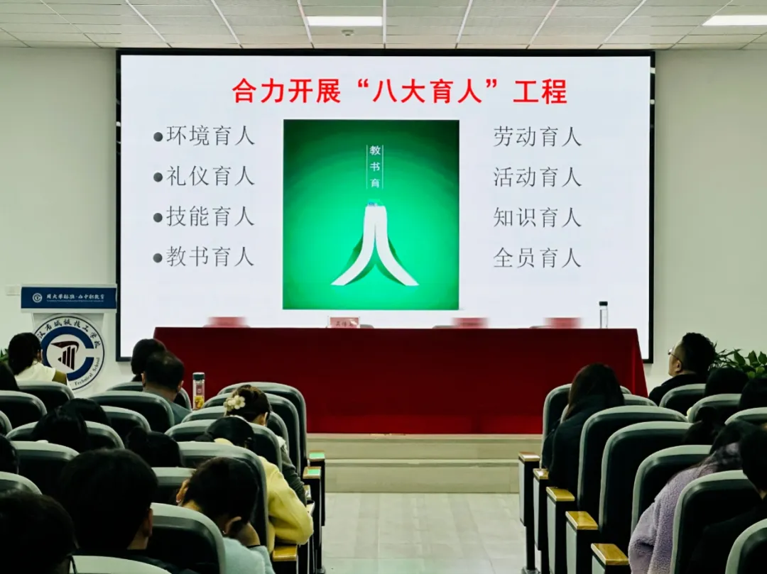 深耕“八大育人”工程,夯实育人根基。相关负责人重点部署了环境育人、礼仪育人、技能育人、教书育人、劳动育人、活动育人、知识育人、全员育人的“八大育人”工程。会议强调,全体教职工要立足岗位实际,将育人理念融入教育教学、管理服务的全过程,通过多元化的育人举措,助力学生成长为德技并修、全面发展的高素质技术技能人才。