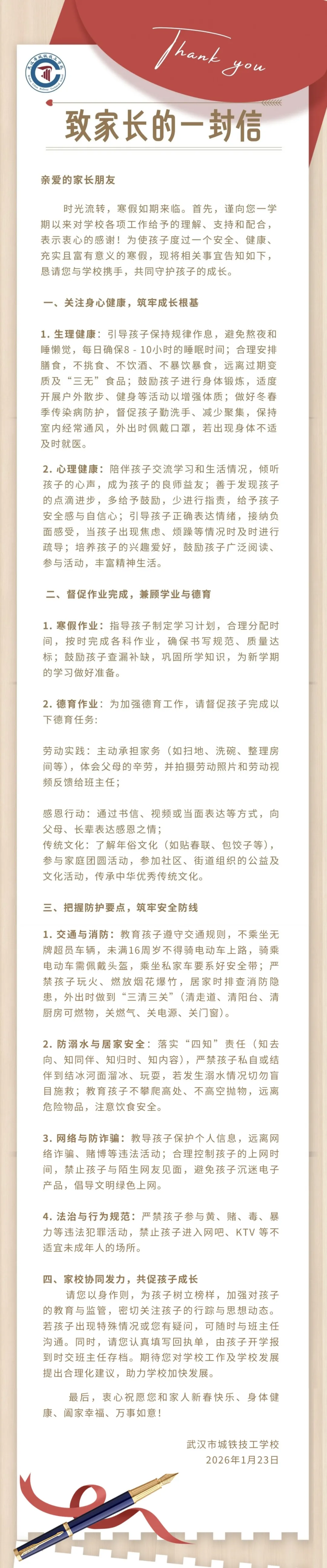 本次期末线上家长会的顺利召开,不仅畅通了家校沟通的桥梁,更明确了假期前后的各项重点工作,凝聚起家校共育的强大合力。武汉市城铁技工学校将继续携手各位家长,坚守育人初心、深耕育人之路,用心守护每一位学生的成长与进步。衷心祝愿每一位学生都能度过一个安全、充实、有意义的寒假,也祝愿各位家长阖家安康、顺遂无忧,家校同心同行,共赴孩子更美好的未来!