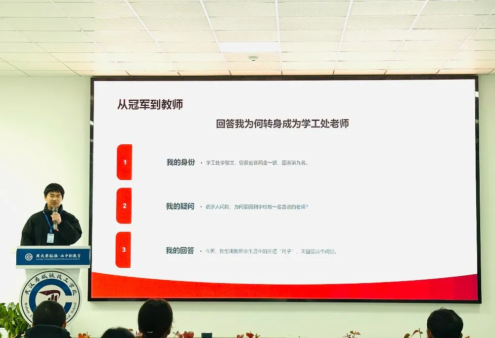 为呈现最佳演讲效果,9名决赛选手均进行了充分筹备、全力以赴,展现出极高的专业素养与敬业态度。所有选手全程脱稿演讲,对内容反复打磨、逐字斟酌,力求将每一份育人初心都传递到位;同时精心制作配套PPT,搭配贴合主题的精美图片与动听背景音乐,以视听结合的方式增强演讲感染力,让师德故事更具画面感与穿透力。从内容构思到仪态表达,从PPT打磨到配乐甄选,每一处细节都凝聚着选手们的用心与坚守,展现出新时代武汉市城铁技工学校教职工们严谨务实、精益求精的作风,每位选手的表现都精彩纷呈、值得点赞。