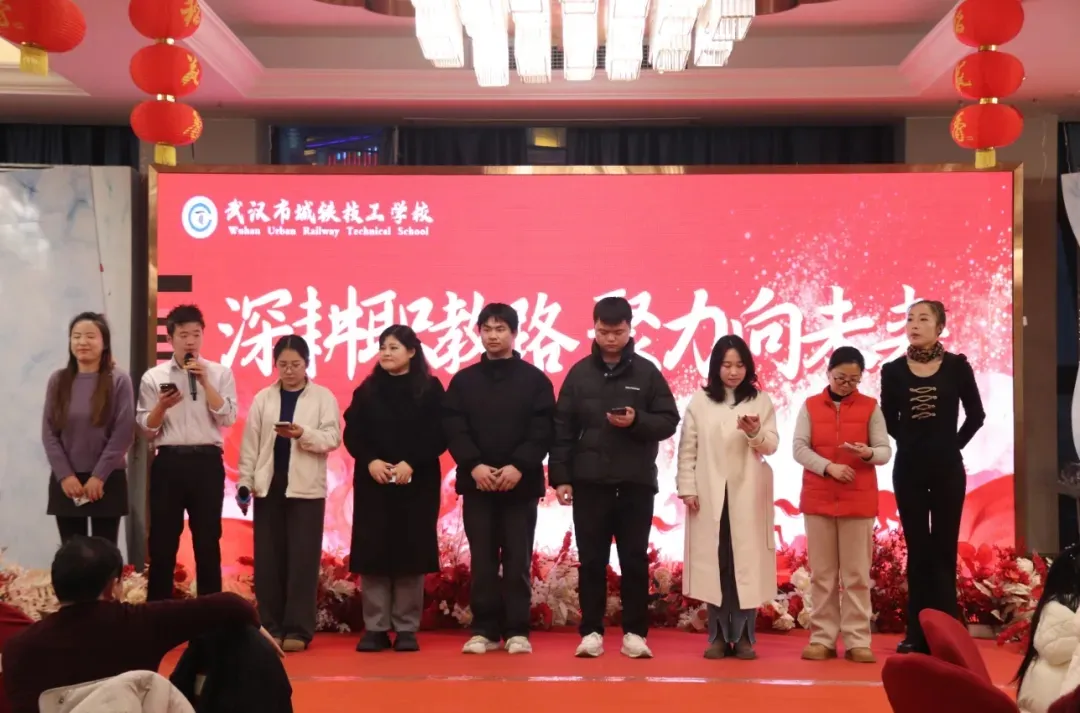 参加师风师德演讲比赛决赛的教职工们还在年会现场带来集体诗朗诵《同心筑梦,铁轨生光》,以深情告白致敬学校职业教育事业与并肩同行的时光,她们深情并茂的演讲赢得了现场观众的阵阵掌声。