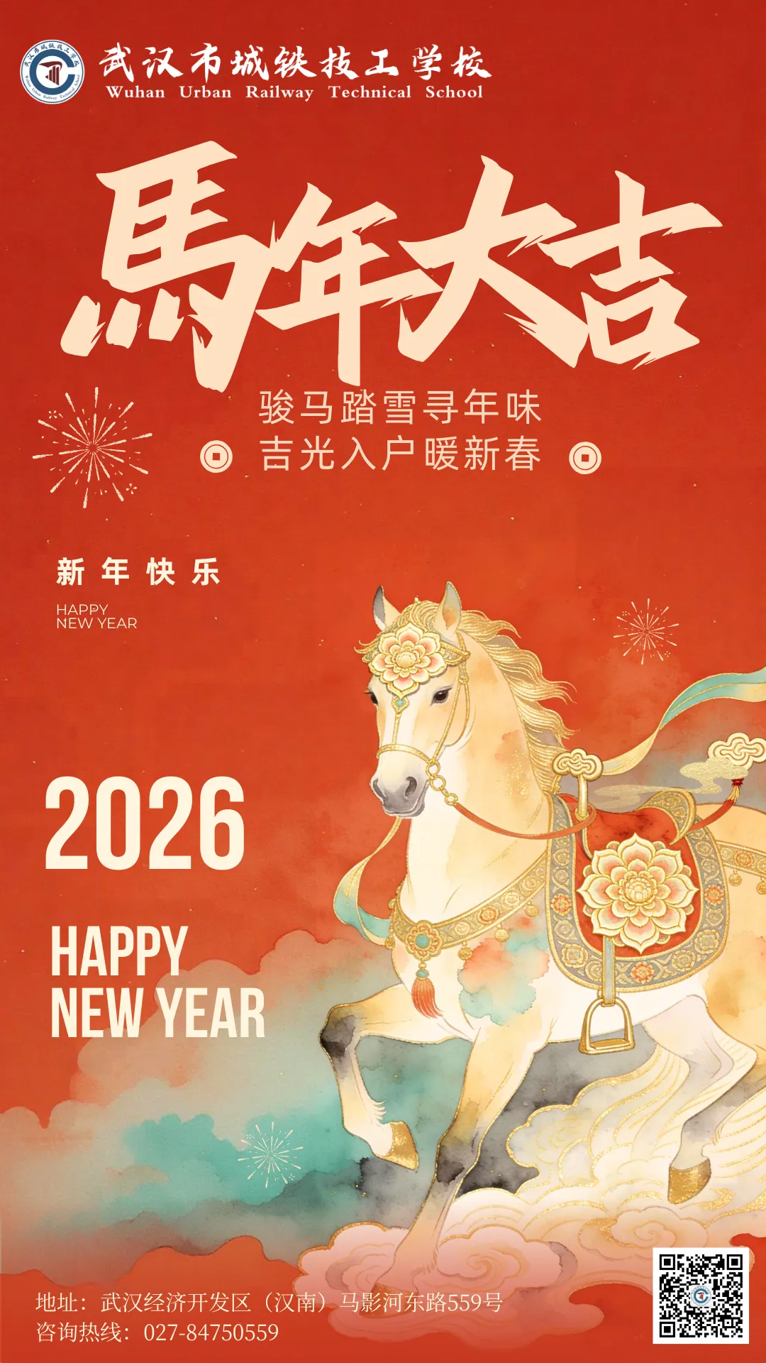 马启新程,福伴新岁。值此2026年新春佳节之际,我谨代表武汉市城铁技工学校,向关心支持学校发展的各级领导、各界友人、各位家长朋友们、合作院校与企业致以诚挚谢意;向深耕职教、默默奉献的全体教职员工致以崇高敬意;向逐梦成长的全体学子致以亲切问候;向所有关注学校发展的每一位家人,送上真挚的马年祝福,愿大家新春快乐、万事顺意、马到成功!