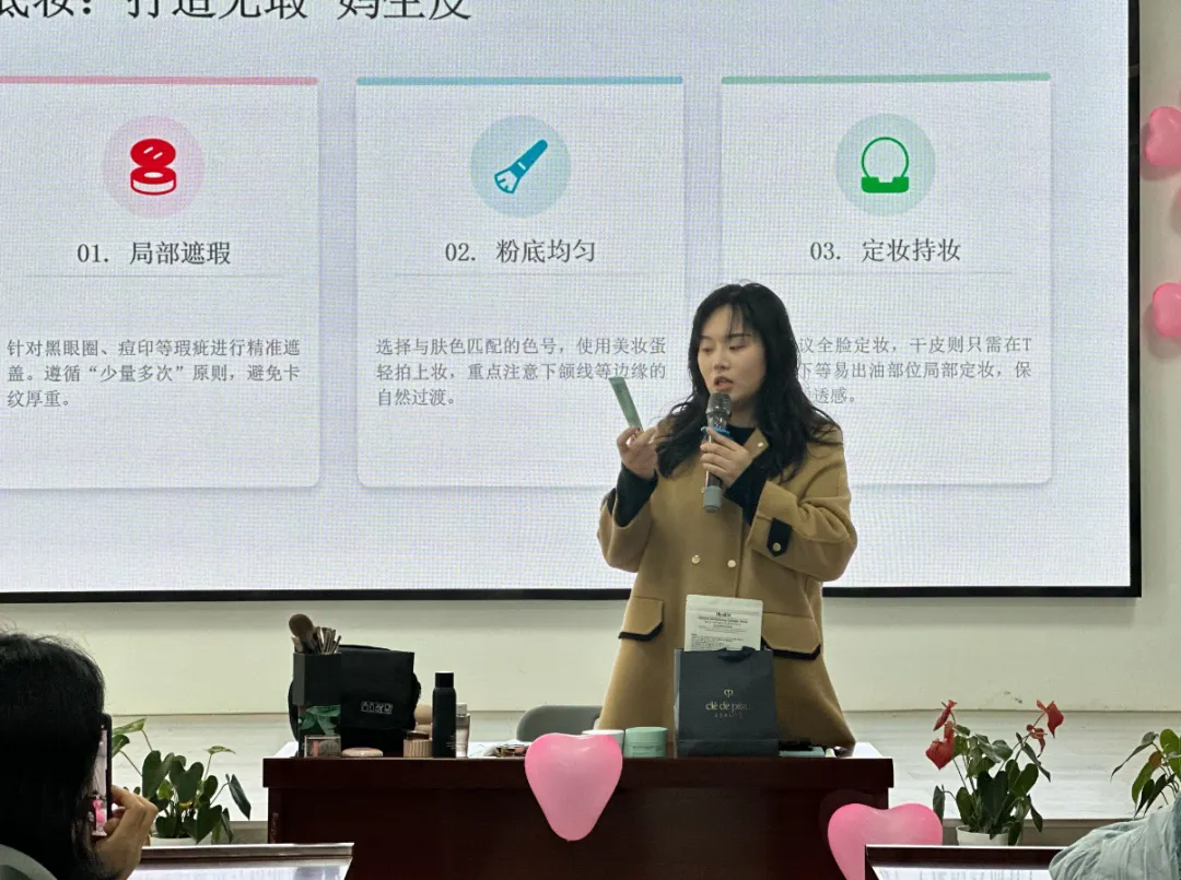 在日常淡妆沙龙环节,我校妇女联合会副主席甘雨晨结合职场女性的日常需求,以理论讲解与现场示范相结合的方式,深入浅出地拆解了日常淡妆的核心技巧,从护肤打底、粉底涂抹,到眉形修饰、唇妆搭配,再到定妆收尾,每一个步骤都讲解得细致入微,还针对不同肤质、不同脸型的特点,给出了个性化的化妆建议,贴合女教职工的日常场景,简单易操作,让在场的老师们受益匪浅。