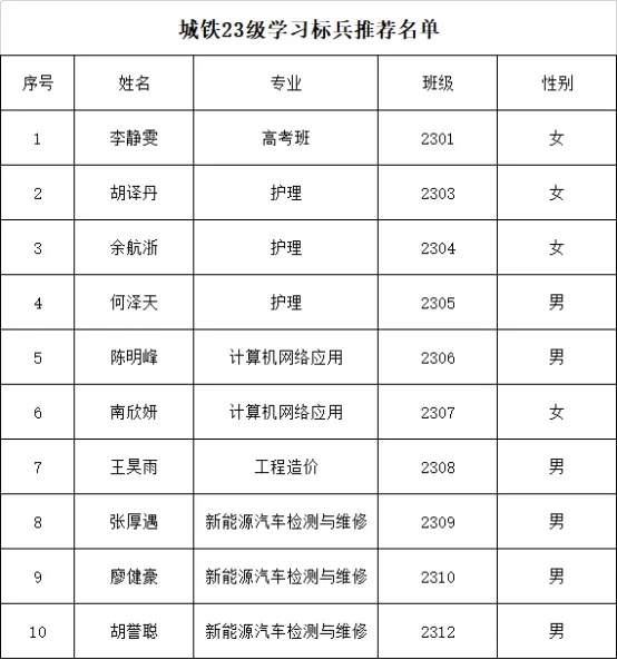 武汉市城铁技工学校23级学习标兵