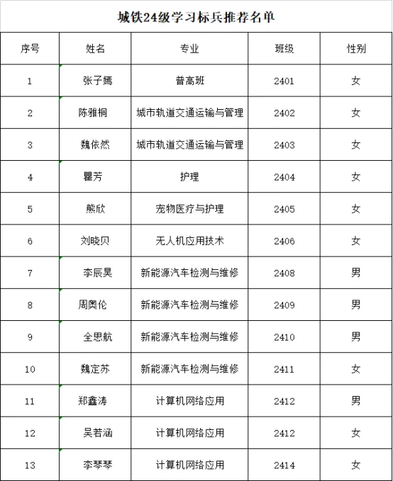 武汉市城铁技工学校24级学习标兵