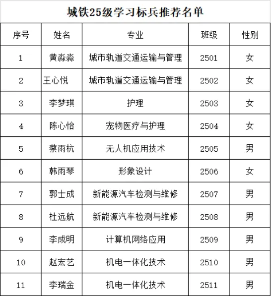 武汉市城铁技工学校25级学习标兵