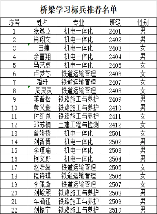 武汉铁路桥梁高级技工学校(城铁校区)学习标兵