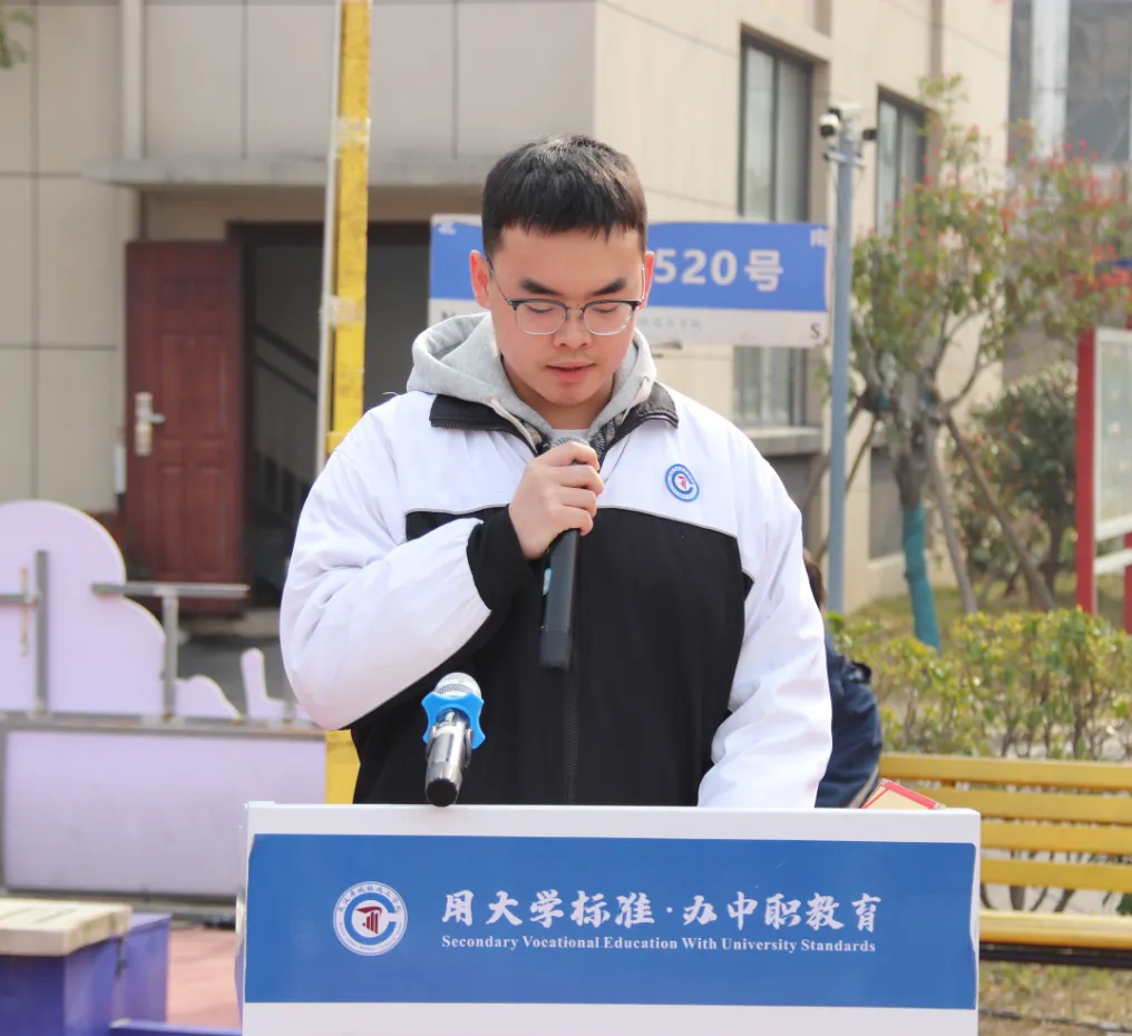2305班何泽天同学作为学生代表上台发言,他以中职学子的视角,真挚分享了自己的成长感悟与心声。他表示,作为一名中职学生,深知青春梦想的实现,离不开校园安全的守护,更离不开精湛技能的支撑。他表示:校园安全是学习生活的第一道防线,唯有将安全牢记于心、付诸行动,才能安心追梦。他还结合去年参加湖北省技能大赛并斩获银奖的经历,他分享了自己的技能学习心得:一是沉下心打牢基础,一步一个脚印夯实技能根基;二是守规范牢记安全,将安全意识融入实训每一个细节,养成严谨的职业素养;三是敢勇于突破,遇到瓶颈不放弃,勤学苦练、精益求精。最后,他鼓励全体同学不必妄自菲薄,希望大家在青春赛道上奋力奔跑,用努力与汗水成就精彩人生,同时也表达了对学校培养和老师悉心教导的深深感恩。