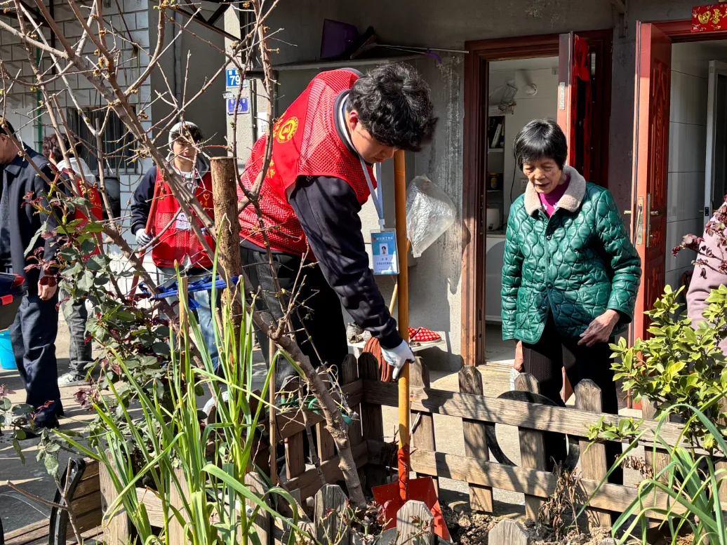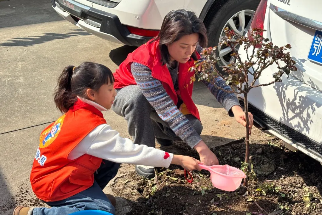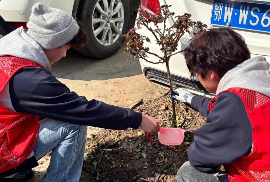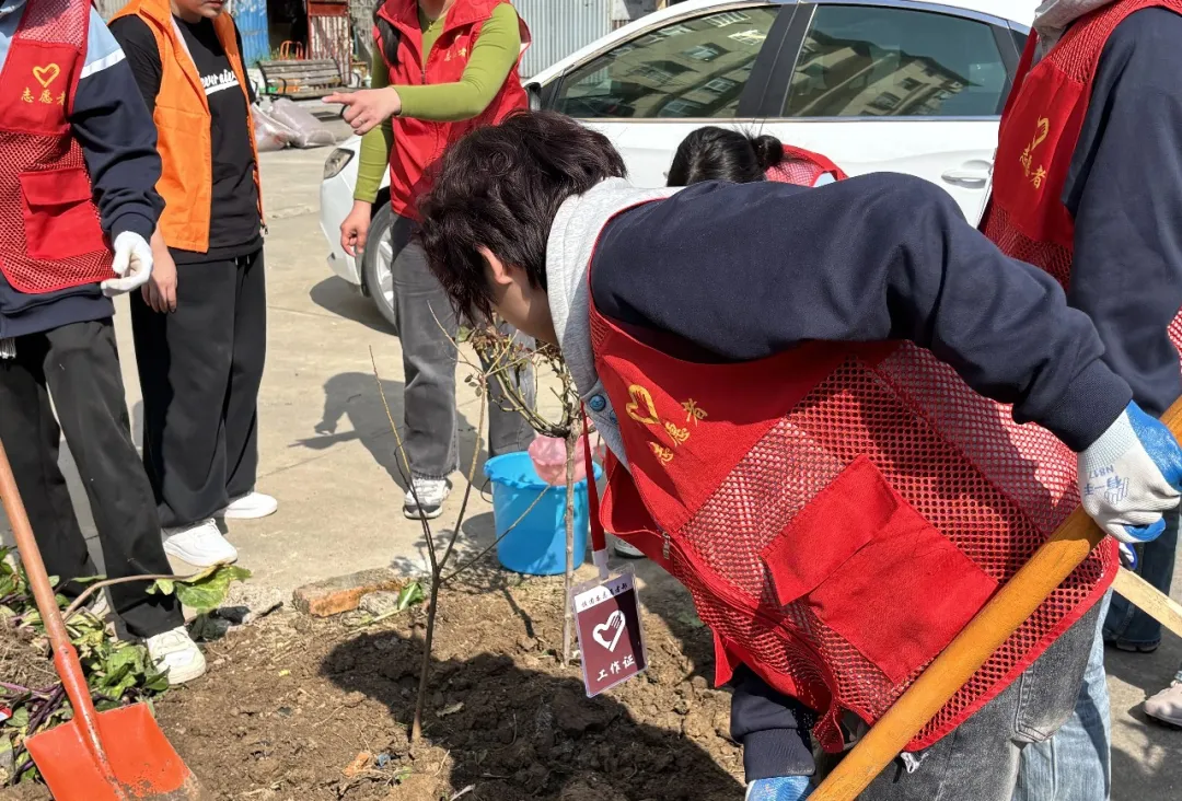 树坑挖好后,大家默契配合,小心翼翼地将树苗放入坑中,扶正树苗、回填泥土,用脚轻轻踏实,最后提着水桶,缓缓为新栽种的树苗浇上生命之水。整个活动各项流程衔接顺畅、秩序井然。欢声笑语间,一棵棵小树苗迎风挺立,嫩绿的枝叶在春风中轻轻摇曳,为社区增添了满满的勃勃生机,也展现了我校共青团团员的良好素养与责任担当!