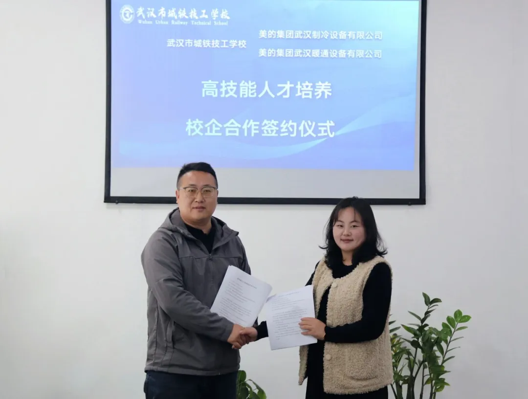3月20日,武汉市城铁技工学校与世界500强企业——美的集团签署校企合作协议,共建智能制造产业学院。美的集团武汉制冷设备有限公司人力资源总监罗锦、招聘经理杨紫薇,我校有关校领导、招培处主任张港燕出席签约仪式,共同见证校企合作新篇章的开启。