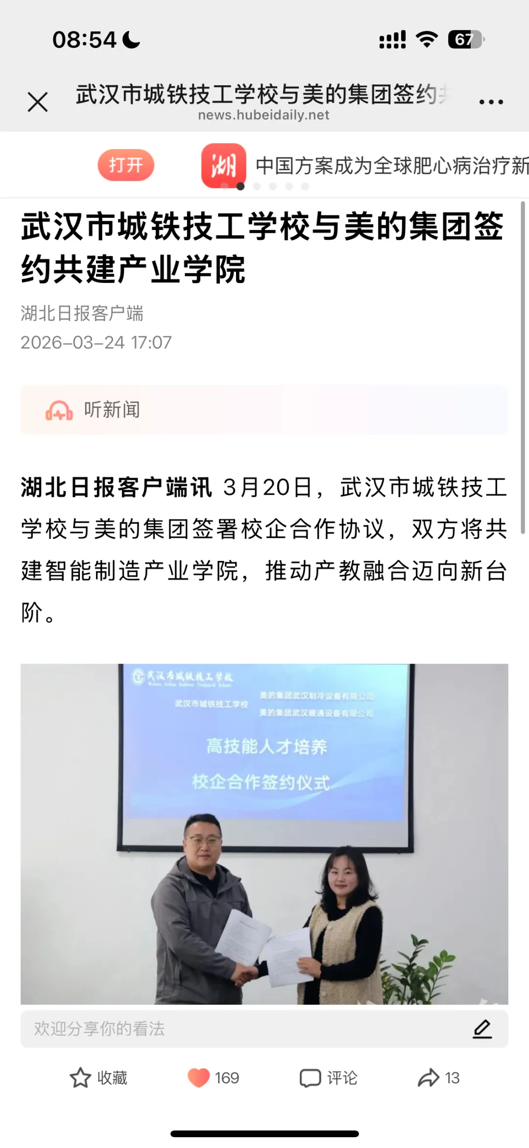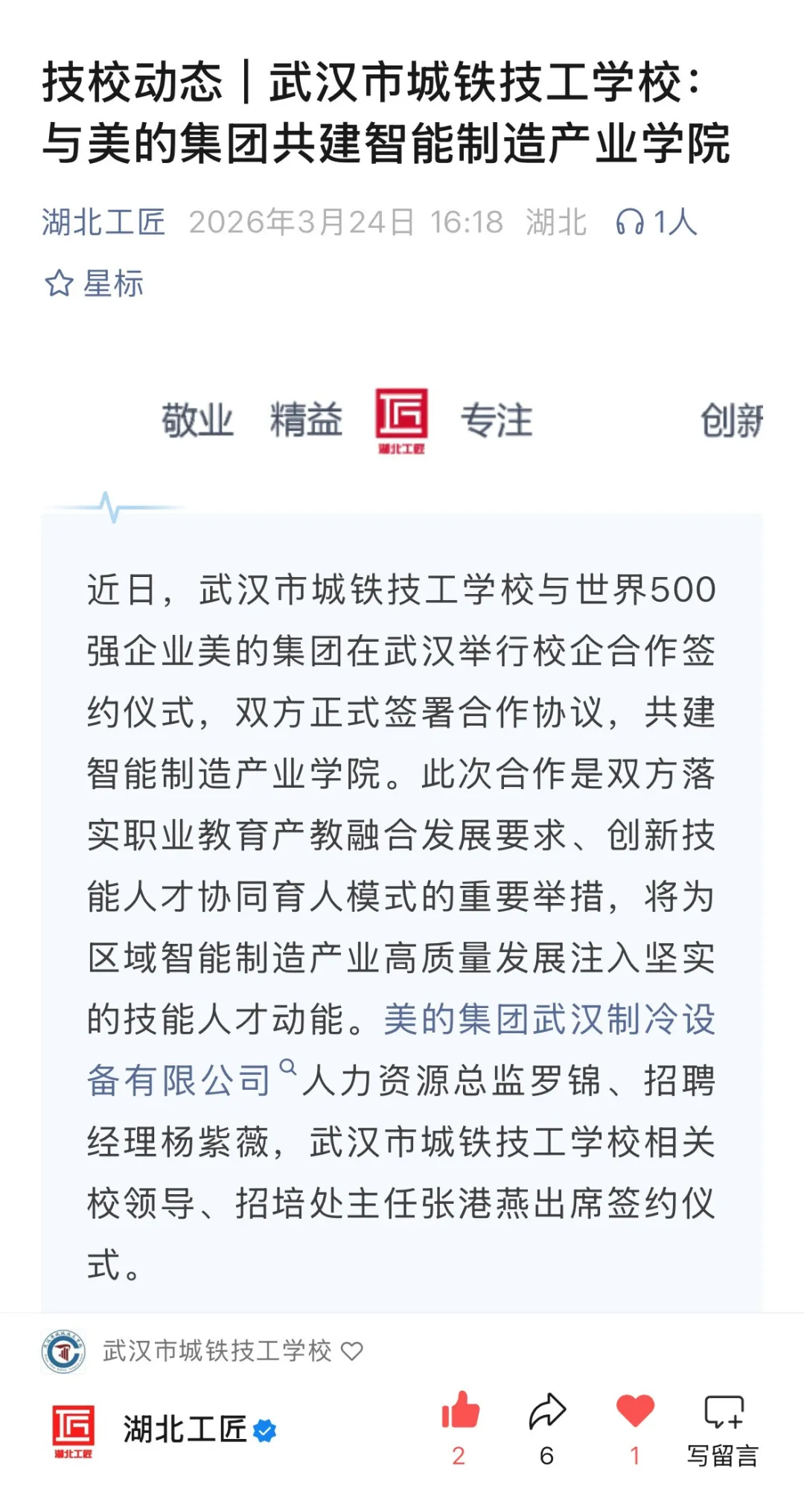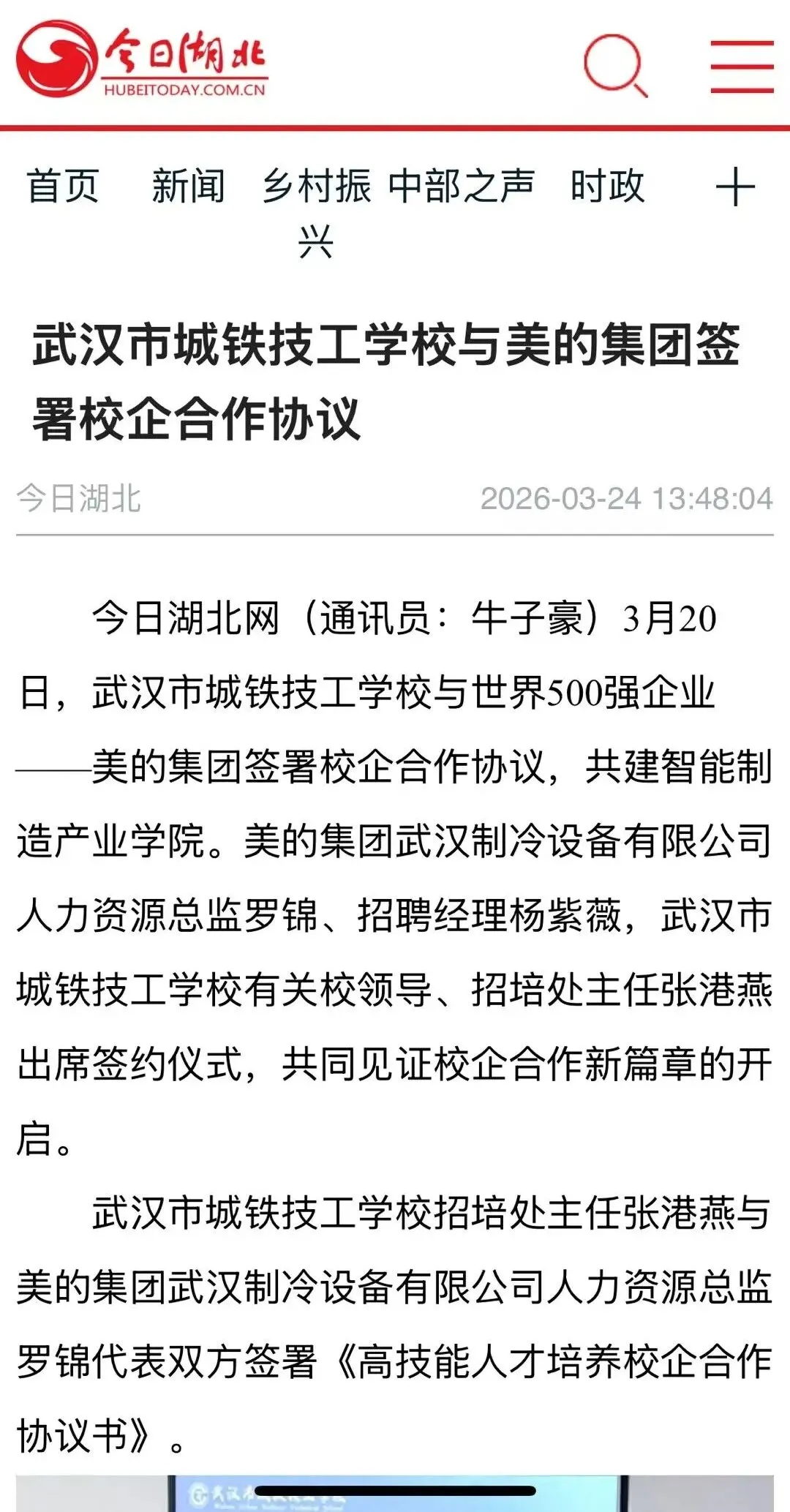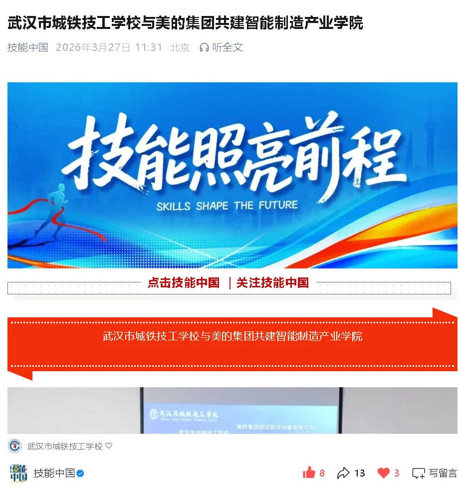 3月20日,我校与美的集团武汉制冷设备有限公司正式签署合作协议,共建智能制造产业学院与校企合作订单班,定向培养适配智能制造产业需求的高技能人才。此次校企合作签约,获得以下权威平台关注报道: